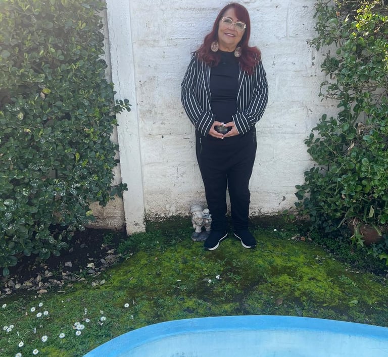 Gloria Sandoval haciendo Muladhara Mudra: Un gesto de estabilidad y conexión profunda con la tierra, promoviendo seguridad y equilibrio emocional.